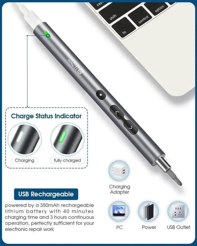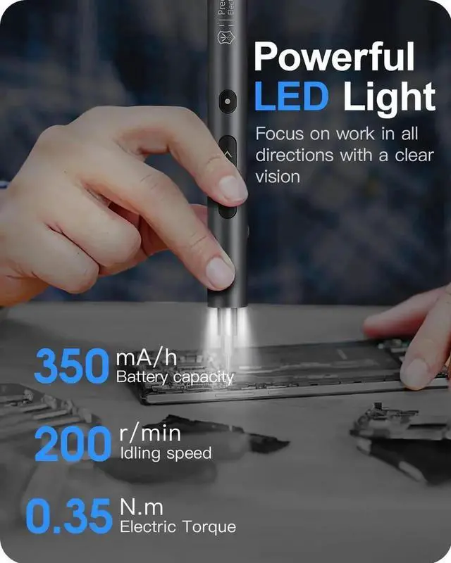 Small and PowerfulThis mini torque screwdriver has a rotate speed of 200r/min, automatic mode with 0.25 - 0.35N. M torque, powered by 350mAh rechargeable lithium battery, 30~40 mins charging time, and works continuously for 2-3 hours which has totally power enough for your electronic repair work.