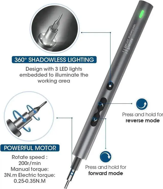 LED Light & USB ChargingThis cordless electric screwdriver is designed with 360° shadow-less lighting and embeds 3 LED lights to brighten the working area. With a strong magnetic bits design, the screwdriver will firmly absorb the screwdriver bits.