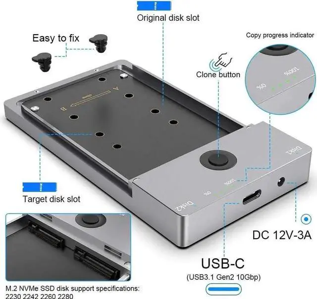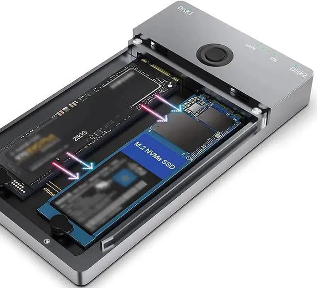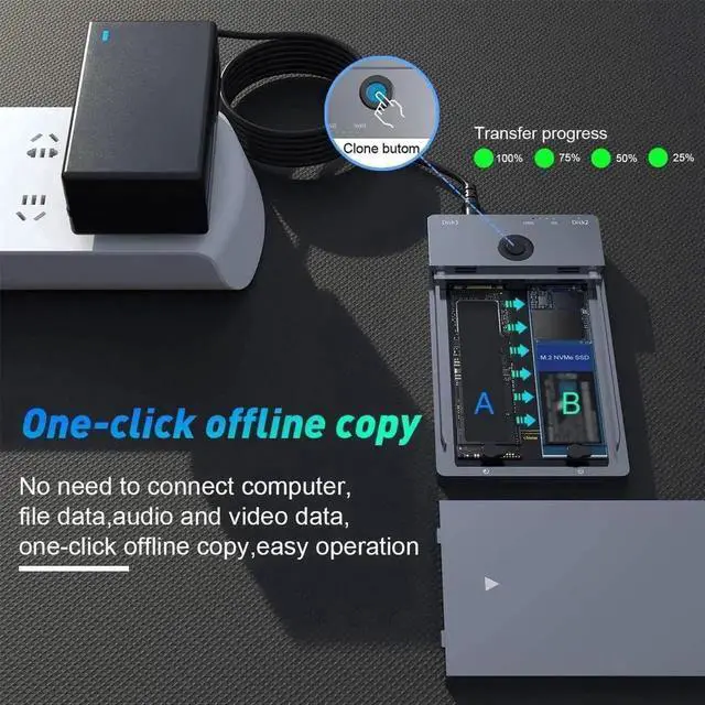 One-Key Offline Cloner An easy clone, No need to use the comupter. Just plug the two M2. NVME SSDs in and hooked up the power, click the Clone button for 3-5 seconds to quickly clone all files from A SSD to B SSD, there are LED status indicators and the process completed quickly.