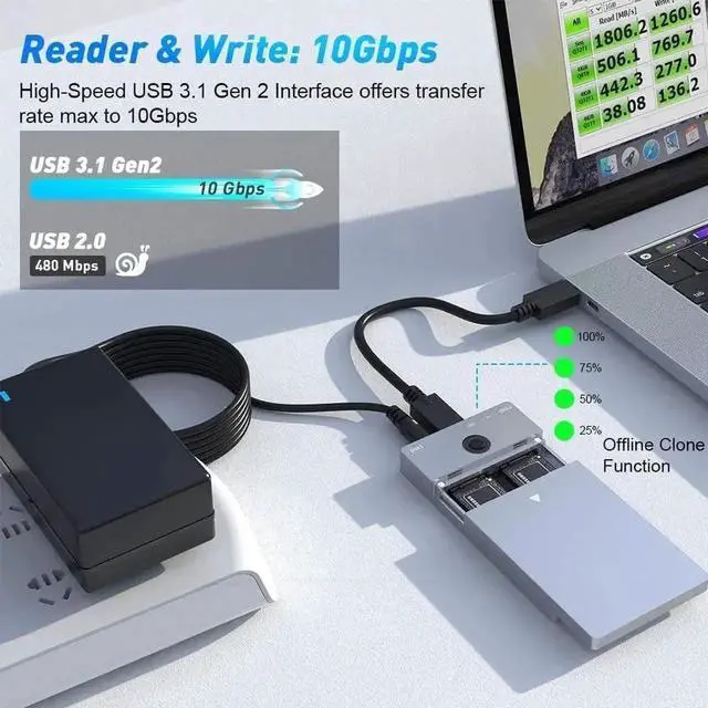 NVMe M. 2 Duplicator It functions greatly as an Offline NVMe M. 2 Duplicator to clone important data between 2 SSDs quickly without a computer, and can be used as a Dual-Bay NVMe Docking Station to help expand storage capacity with One SSD or Two. NOT support SATA ssds.