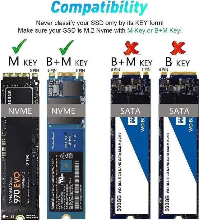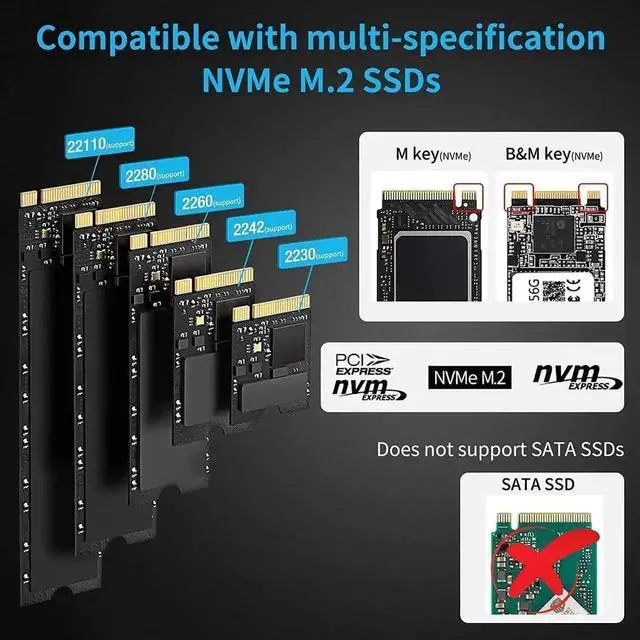 Before PurchaseThis NVMe duplicator support two M. 2 nvme ssds with M and B&M Keys(2230, 2242, 2260, 2280). NOT support SATA ssds. 2. When using the Offline Clone Duplicator, please make sure the capacity of target M. 2 NVME ssd larger than original M. 2 NVME ssd. 3. When using or duplicating a drive, especially a large one, it's best to use with a cooling fan for better heat dissipation.