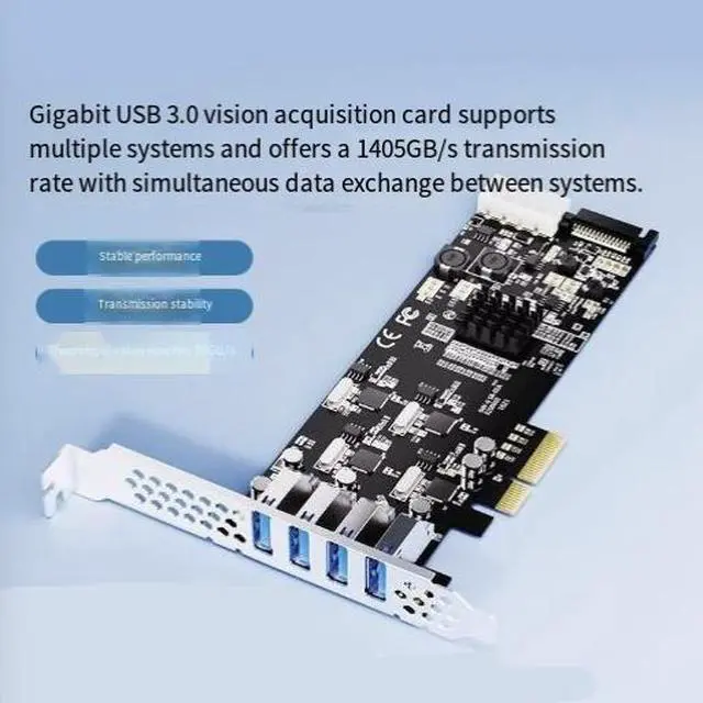 Maximize your system's USB 3.0 performance with this PCIe to 4-Port USB 3.0 Expansion Card. Unlike standard USB hub-based designs, this card features four independent NEC uPD720202 USB 3.0 controllers paired with a Pericom PI7C9X2G608GP PCIe packet switch, delivering dedicated 5Gbps bandwidth per port for a total aggregate throughput of 20Gbps. This architecture makes it the ideal solution for industrial vision capture, multi-camera systems, and high-bandwidth data acquisition applications.