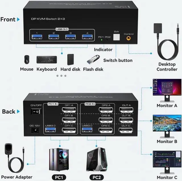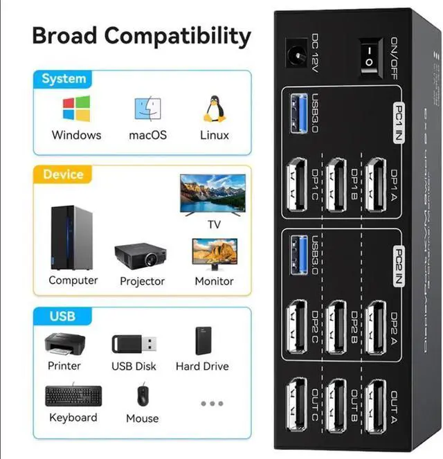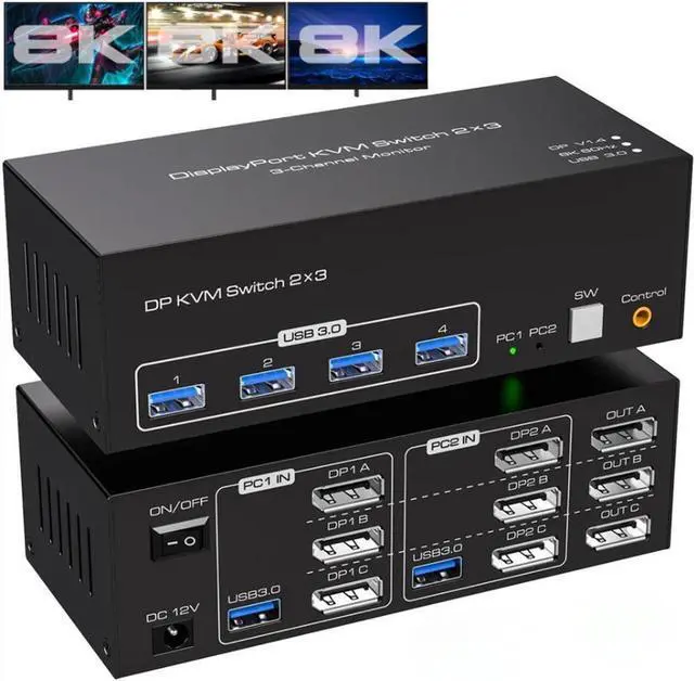 [3 monitor 2 computer dp kvm switch] This KVM Switch is for you to control them using one set of keyboard, mouse and 3 monitors to make your work space tidy and efficient. Only when your computer supports 3 display or multi display, you can use this KVM to achieve 2 PC to share 3 monitors.