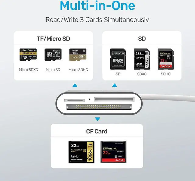 Read 3 Cards Simultaneously: the compact flash card reader transfers data between SD card to CF card and Micro SD card to CF card