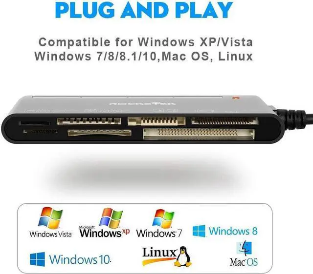 Broad CompatibilityMulti-In-1 Card Reader build-in USB 3.0 connection, compatible with Mac OS(macbook pro/macbook air), Linux, Chrome OS, Windows XP/Vista/7/8/ 8.1 /10 and etc. LED indicator will be ON when the card reader is connected to computer.