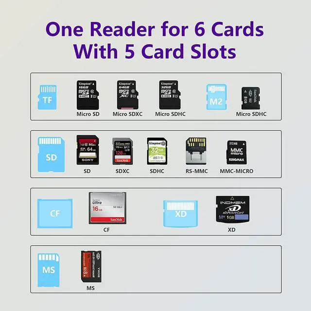 [Support more cards]: This multifunction card reader is equipped with TF /SD /MS /M2 /XD /CF card slot. Supports SDXC, SDHC, SD, M2, CF, MS, Micro SDXC, Micro SDHC, Micro SD cards, UHS-I