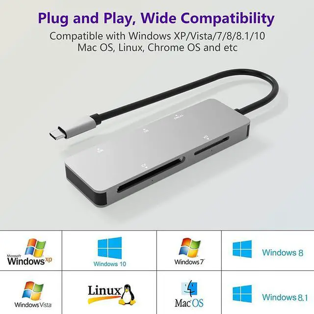 [Simultaneously read and write on five cards]: Type C Camera Card Reader is designed withTF /SD /MS /M2 /XD /CF card. Type C Card Reader reads and writes five cards at the same time, hot-swap function saves the trouble of plugging and unplugging and improves work efficiency.