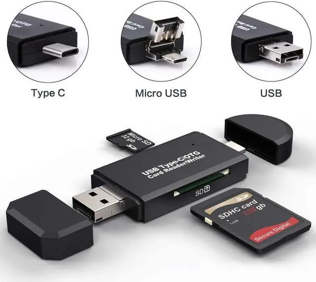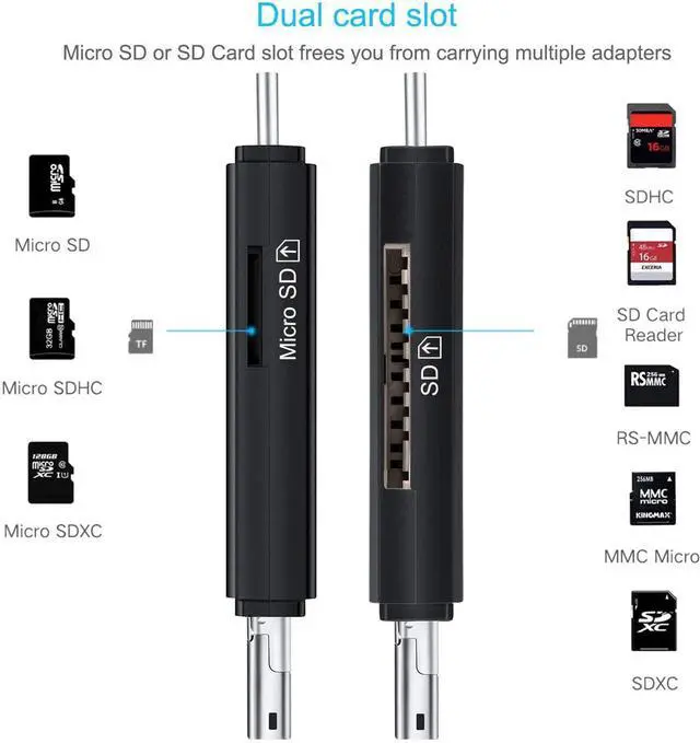 [3 in 1 SD Card Reader] The SD card camera reader with 3 plugs, which is USB 2.0, micro USB & USB C plugs, compatible for all USB C device, Laptop, tablet and Android smartphones that support OTG function. Double card slot of memory card adapter supports for SD SD-3C SDXC SDHC MMC RS-MMC TF Micro SDXC Micro SD Micro SDHC Card and