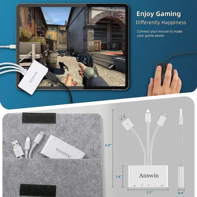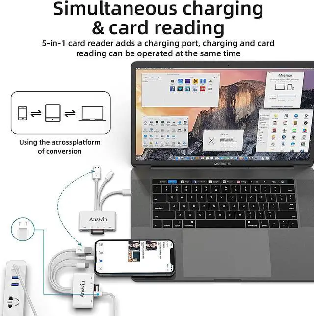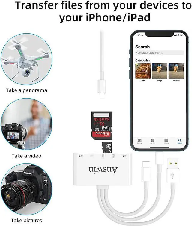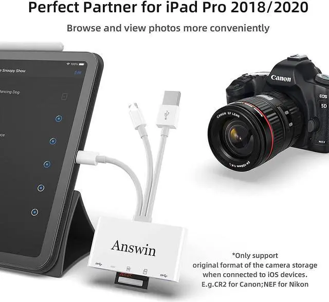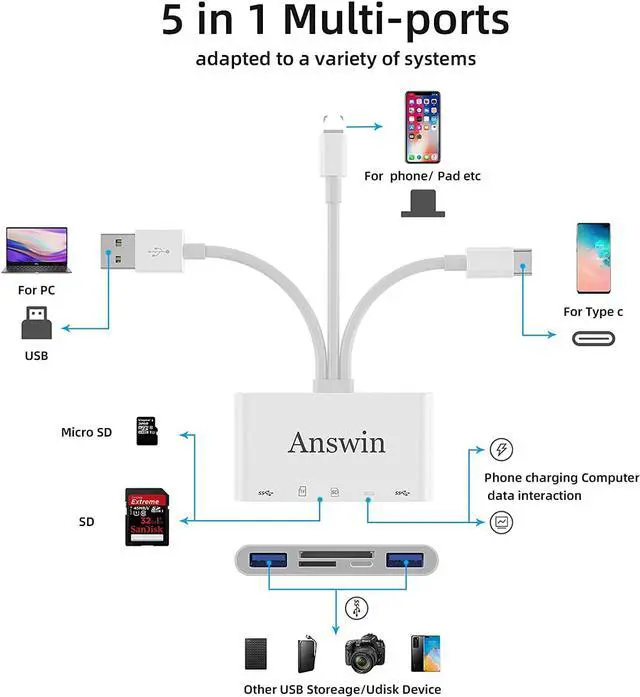Mutilfunction: Answin SD card reader for i - Phone adapter with 2* mutilfunction USB ports, which support USB peripherals, such as mouse, keyborad, USB Flash Drive, USB earphone and etc.