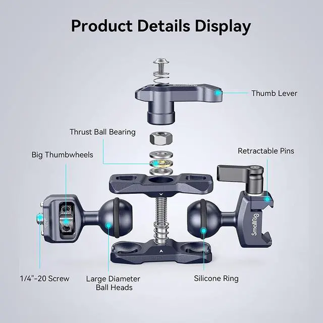 Extensive Compatibility: Dual ball heads with magic arm features for NATO Clamp and 1/4"-20 Screws (With Retractable Pins) on the end for DSLR cameras, action cameras, LED lights, flashes, etc.