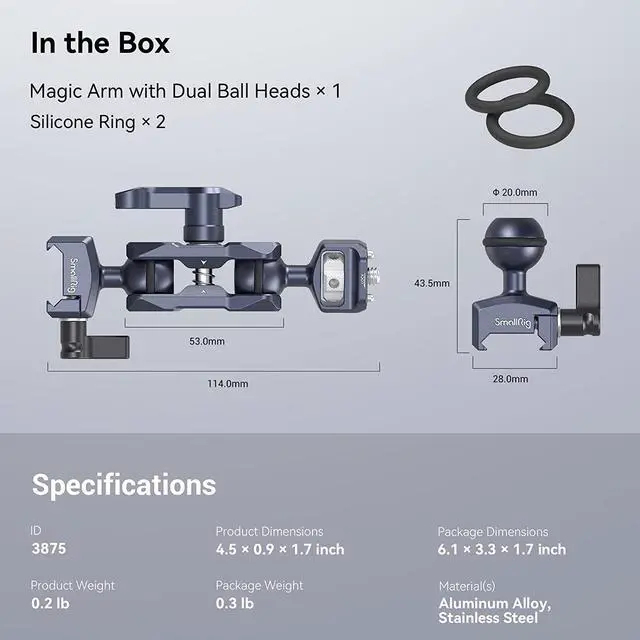 12Ib Payload: The max load capacity of the magic arm is 12Ib ( 5.5 kg). Firmly fix your field monitor, LED lights, audio recorders, etc. Each ballhead is 0.79 inch (20 mm) in diameter. This item weighs only 0.2 Ib (91g), making it easy to carry around and store.