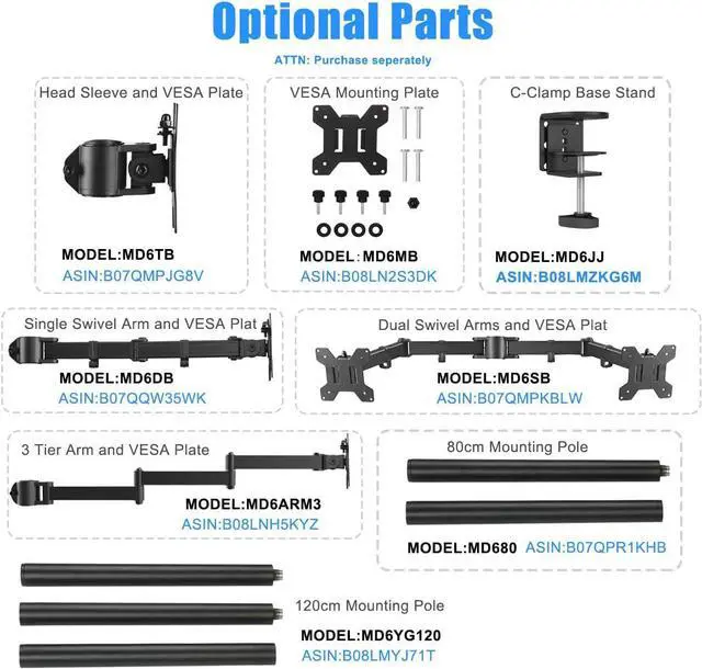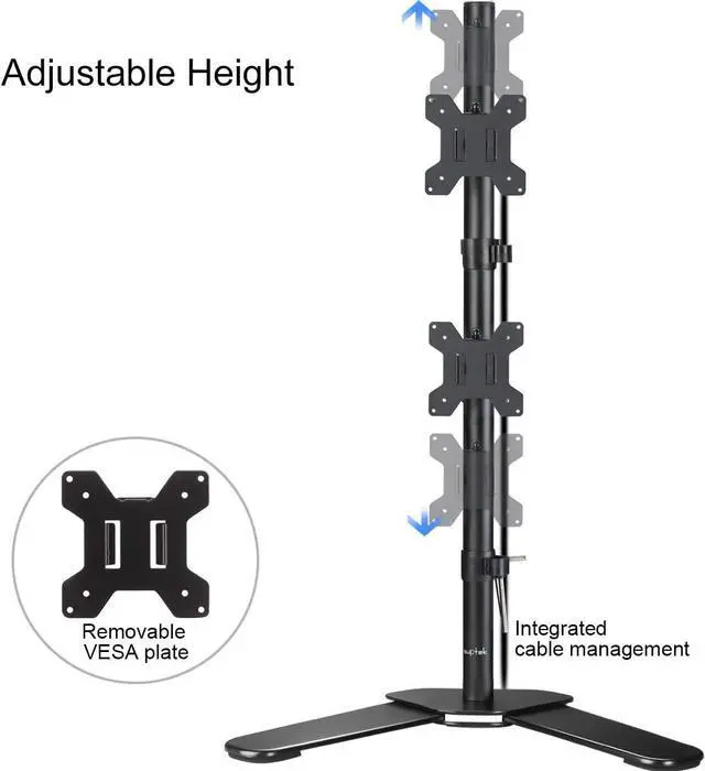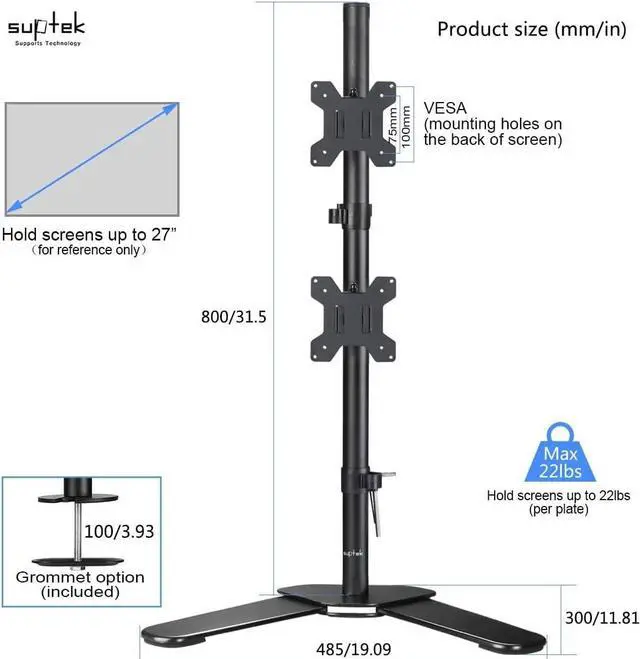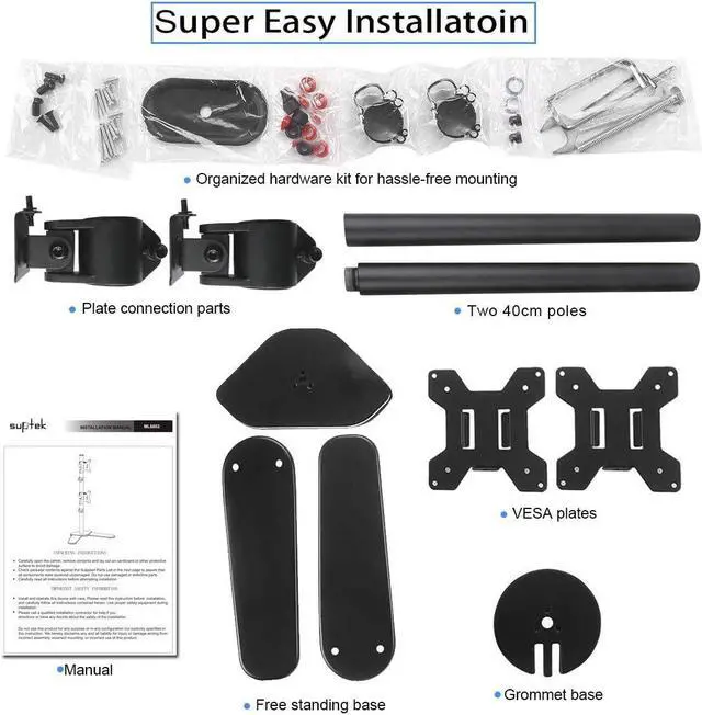 Two install options - Free standing base let you easily move your monitors to anywhere. Optional grommet base (fits desk up to 4" thickness) save your valuable desk space.
