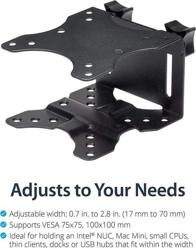 EASILY ADJUSTABLE: The adjustable width of. 7" to 2.8" on this PC mounting bracket is ideal for holding an Intel NUC, Mac Mini, thin client, docking station or USB hub.