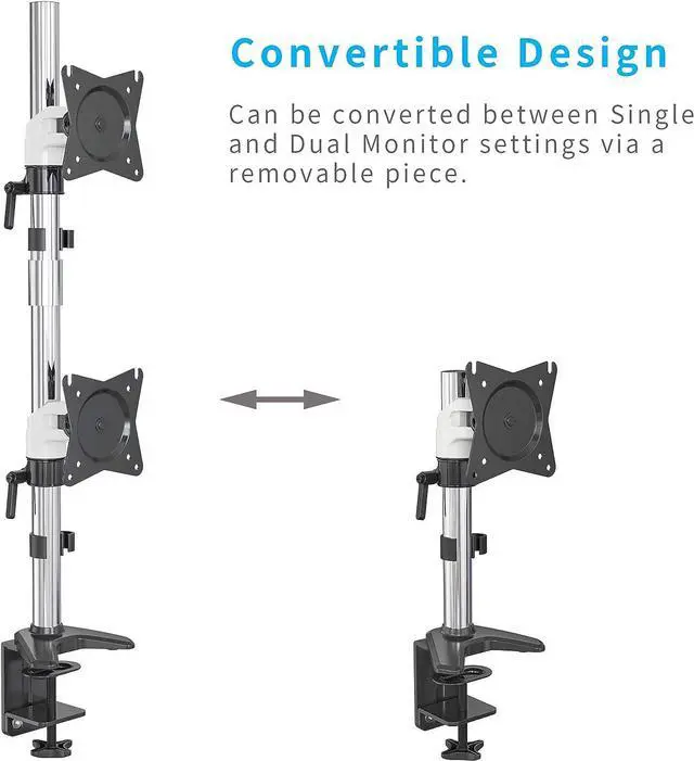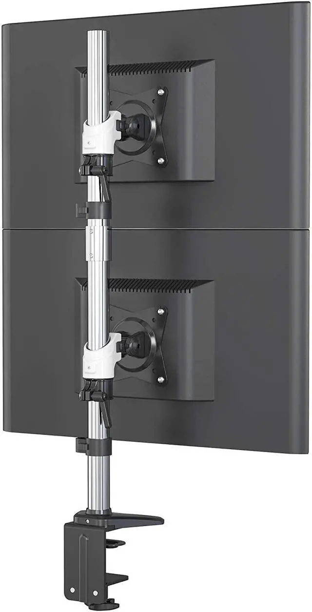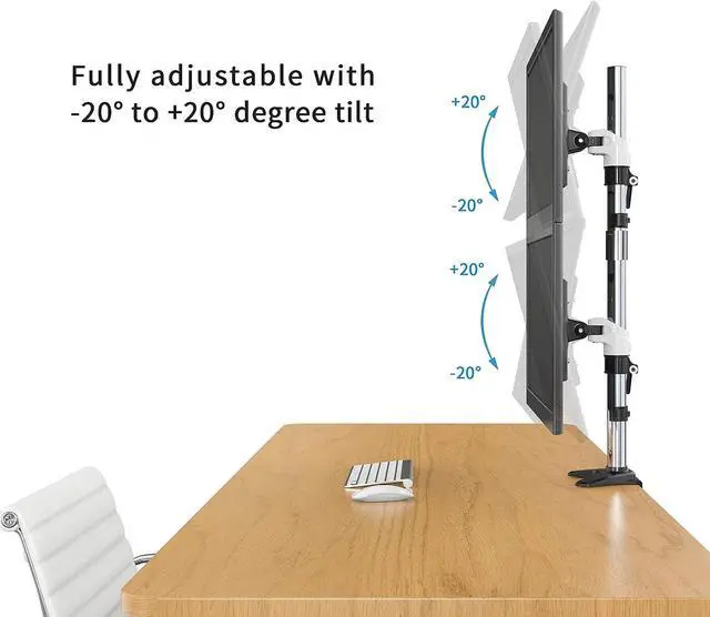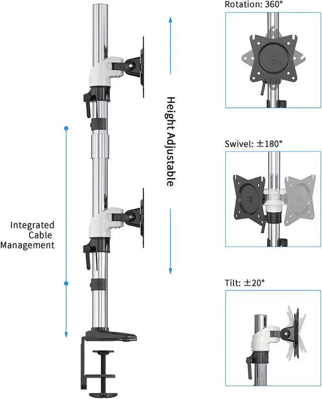 [FULL-MOTION ADJUSTABILITY] The adjustable arm can tilt from ±20°, swivel 180°, and 360° rotation and height adjustment along the center pole. Monitor can be placed in portrait or landscape positions.
