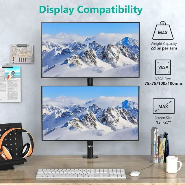 Compatibility: fits monitors up to 27 inch. Weight capacity 22 lbs, VESA detachable 75 x 75 mm or 100 x 100 mm.