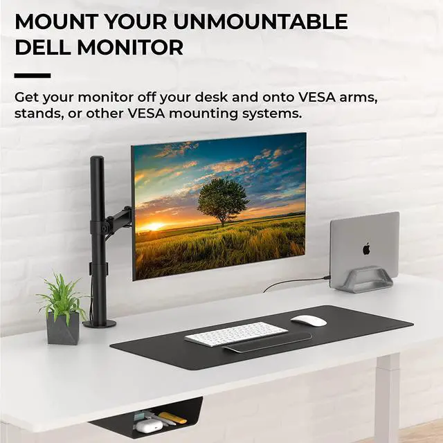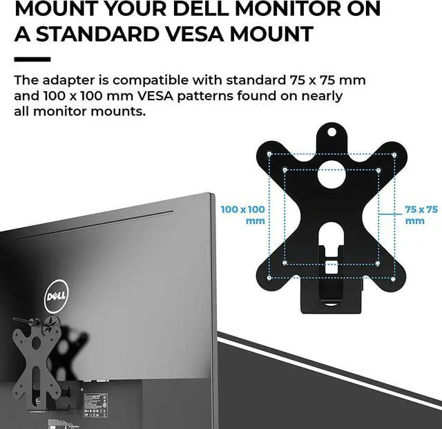 Use this VESA adapter to attach certain Dell monitors to VESA arms, VESA stands, and VESA desk mounts. The mount adapter makes your monitor attachable to standard monitor mounting sizes of 75x75 mm and 100x100 mm found on most workstation VESA mounts.