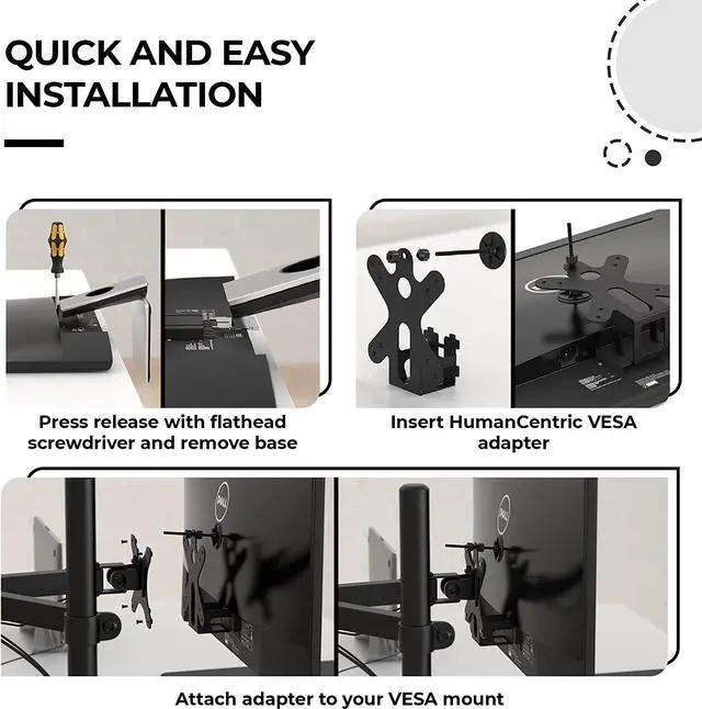 Easy Installation: Youll be able to install HumanCentric Dell monitor bracket in less than two minutes with nothing more than a screwdriver! Just remove the existing base and snap ours in place instead - then connect it right to the VESA mount. Weve tested our mount extensively to make sure it fits your monitor just right.