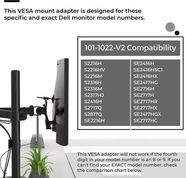Model number warning: If the fourth digit in your model number is an 8 or a 9 (ex. 2418, 2219, etc. ), this VESA adapter bracket will not work. Refer to the chart below to find the correct model for your Dell monitor mounts. Check your model number very carefully!