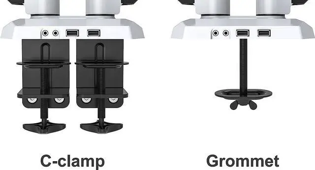 Two Ways to Mount: Option of using a C-CLAMP (max width of 3.35 / 8.5 cm) or a GROMMET (max width 2.36 /6 cm). Easy installation and usage, both clamp and grommet mounting available in the box. Desk mount comes with all parts needed