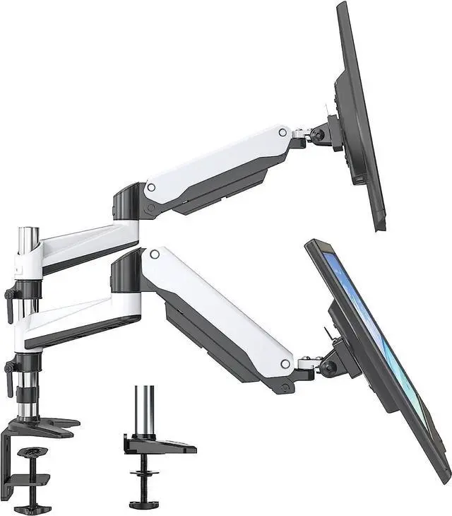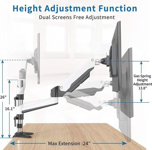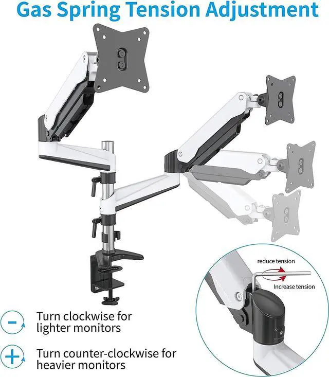 [ERGONOMIC FULL MOTION ADJUSTABILITY] Designed with gas spring system which allows effortless tension adjustment for your monitors. The adjustable arms can tilt from +85° to -90°, swivel ±90°, and 360° rotation. Full motion adjustment provides peace of mind to always have your monitors at an optimal height, helps relieve the strain on your neck and back. The extension arms can be removed for more angle and position adjustability.