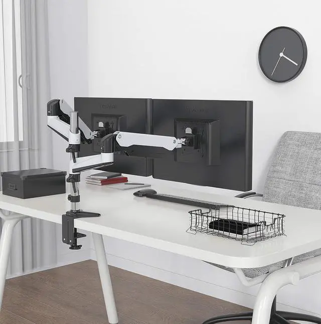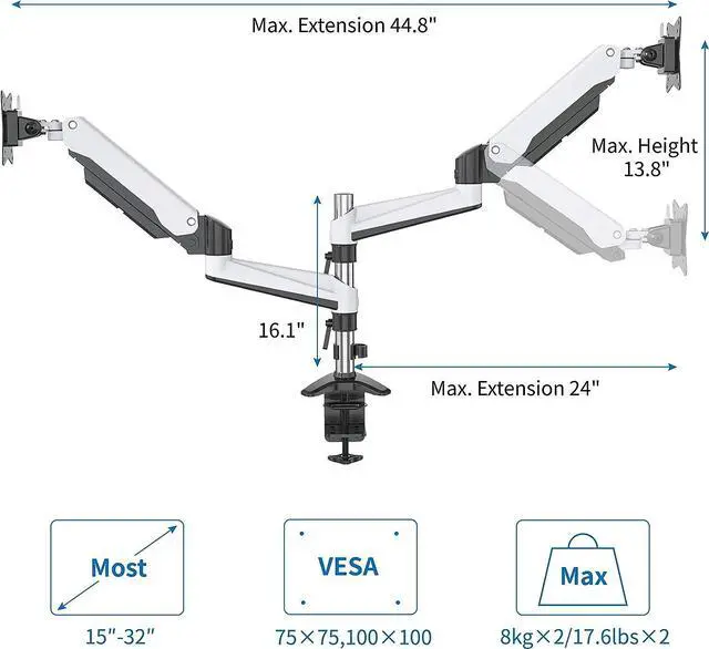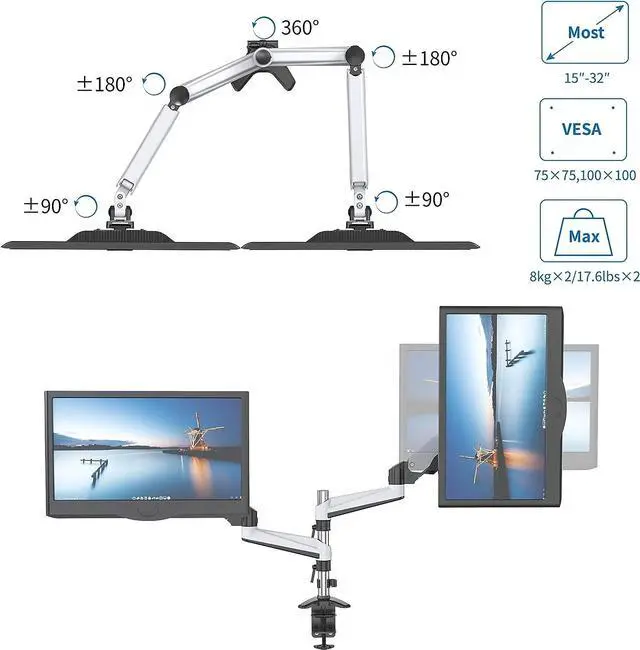 [WIDE COMPATIBILITY] Hold two 15"-32" monitors, each arm holds up to 17.6 lb/8kg monitor with 75mm x75mm or 100mm x 100mm VESA mounting holes.