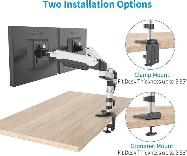 [TWO WAYS TO MOUNT] This Fully adjustable desk mount can be fixed by C-clamp (max thickness 3.35" /85mm) OR grommet installation (max thickness 2.36" /60mm) on any working surface. Both desk clamp and grommet mounting options available in the box.
