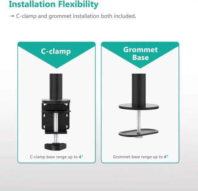 Compatibility: Fits Most Monitors, LCD, Plasma, Panel TV and Flat Screen between 13 and 27 inches (Some up to 30"). The patented plates are detachable and height adjustable. The heavy duty C-clamp is integrated with a two stage locking system and compatible with any desk up to 4.5 inches in thickness and optional Grommet-Base compatible with the desk thickness up to 4 inches