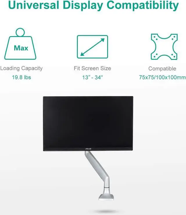 Compatibility: The computer mount fits most screens 13" to 34" in size and 19.8 lbs in weight with VESA 75x75mm or 100x100mm mounting holes.
