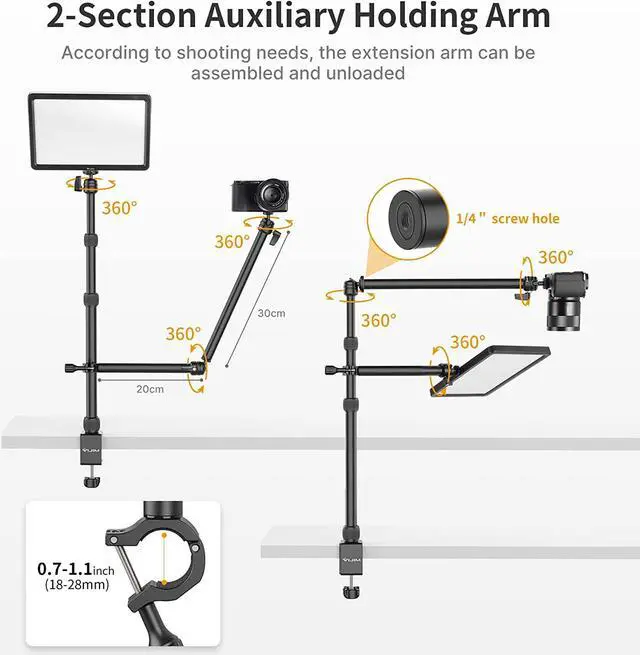 2-Section Auxiliary Holding Arm: 0.7" -11"/18cm-28cm clamp range, suitable most pole & tripod in the market. 2-Section flexible auxiliary holding arm for cameras, lights, phone and More.