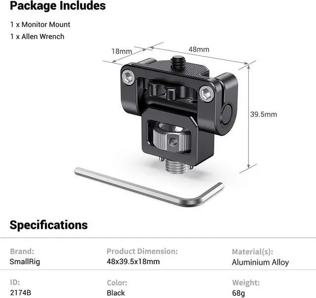 PLEASE NOTEThe max load of this monitor mount is 1.5 kg. Also, SMALLRIG provides friendly 24-hour Customer Support, 30-day No-hassle Return Service, Worry-free 2-year Warranty
