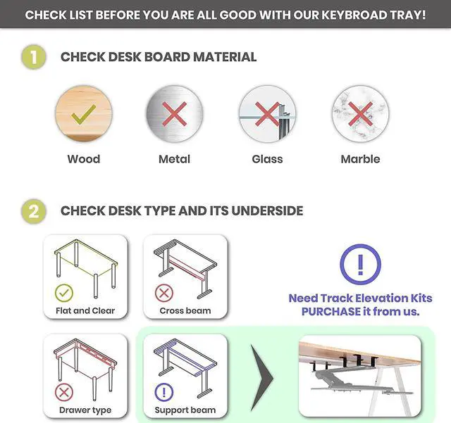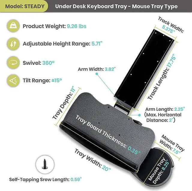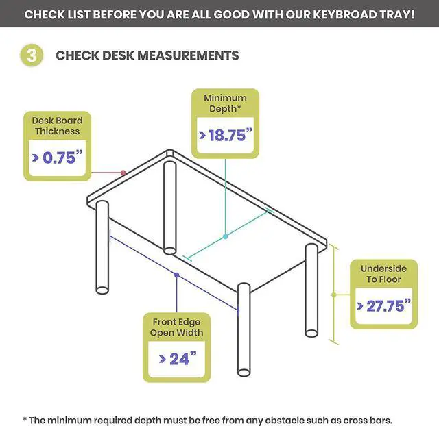 MAXIMIZED COMFORT WITH MINIMUM REQUIREMENTS - Install this articulating keyboard tray on a flat underside of wooden desks with a 18.75X 24 surface and a floor to underside height of 27.75. This will make sure that you have enough space for your new computer keyboard tray.