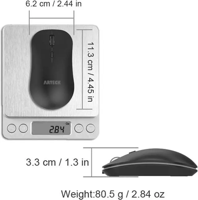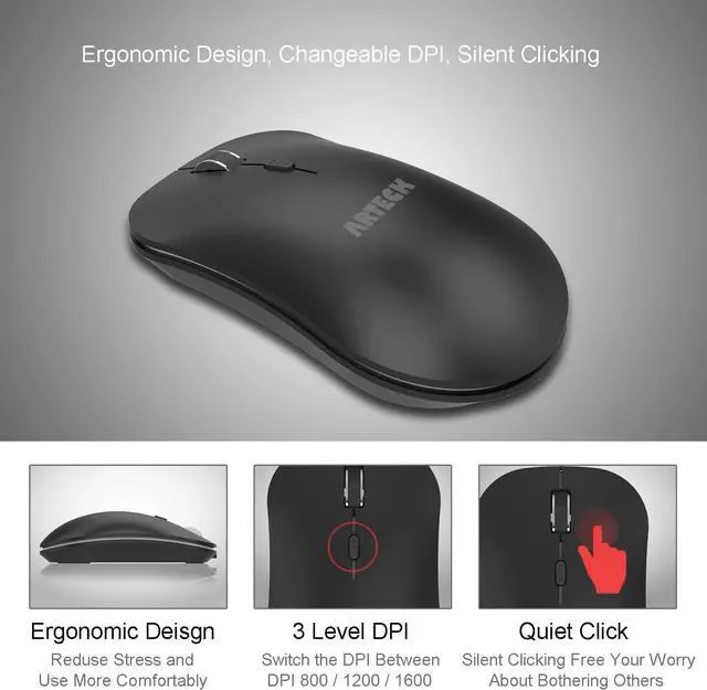 What You Get: Arteck MW162 Wireless Mouse, one nano USB receiver (stored in the back of the mouse), USB charging cable, welcome guide, our 24-months warranty and friendly customer service.