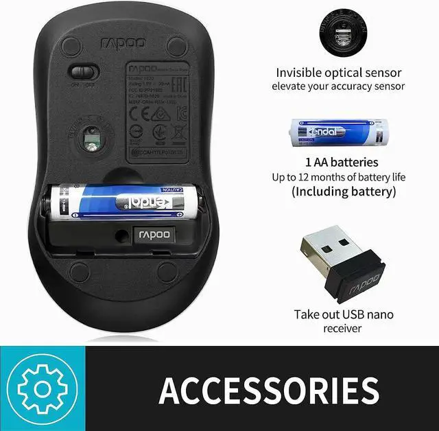 Long battery lifeThe Rapoo 1680 wireless mouse adopts a high-efficiency and energy-saving design, and one AA battery can let you use it for up to 12 months. It protects the environment and saves battery costs. (When not in use, you can turn it off at the bottom of the mouse to achieve a longer-lasting use time)