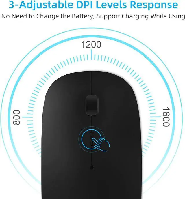 Silent Click & Adjustable Quick Response FunctionThe left and right button mute processing design reduces 90% of noise. It is an ideal mouse for offices, libraries and other places where quiet is required. 3-Level adjustable DPI among 1000, 1200 and 1600 to meet different needs.