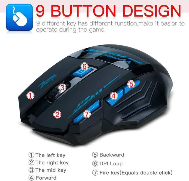 9 BUTTONS&LED LIGHT: There are 9 buttons on this mice. Left, Right, Mid, Forward/Previous page, Backward/Next Page, DPI, Fire Key, Polling Rate, Light Switch, achieve various functions. Blue LED light will light up when you press button to light, is absolutely a cool mouse, especially at night.