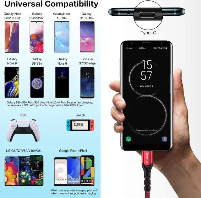 What you get: 2Pack 15ft Nylon Braided USB Type-C Cable. This USB C Cable can fast charge and sync well compatible with PS5 Controller, Samsung Galaxy S10 S9 S8 Note 10 9 8, Moto Z/Z2, LG G5/G6/V20/V30 and other USB C devices.
