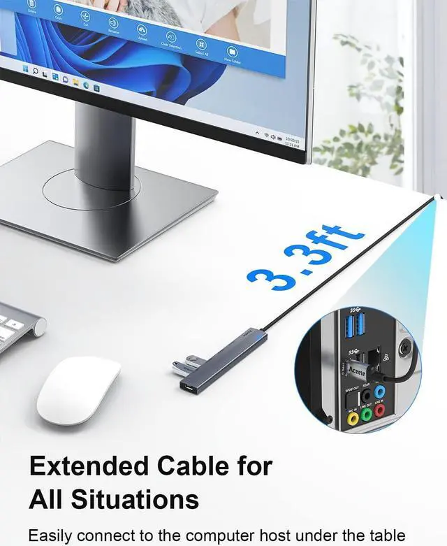 3.3 ft Long Cable + Velcro Closure 3.3 ft long cable is convenient for you to extend the USB port from the computer under desk or all in 1 PC. Use Velcro closures to organize excess cables.