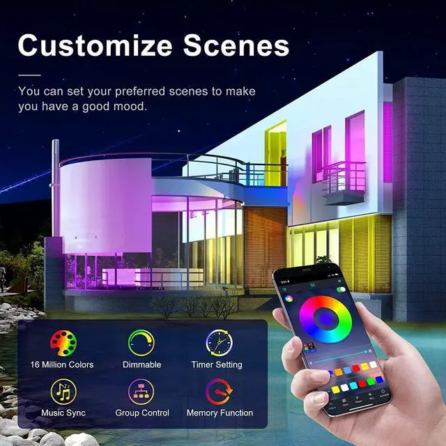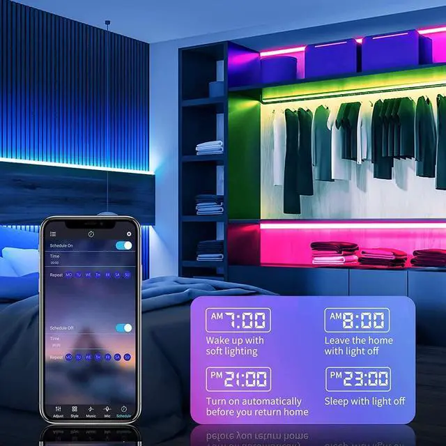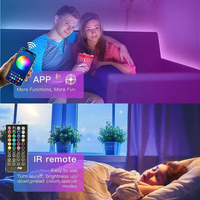 Multi-control LED lights can be controlled by App and 40 keys remote control. Through a stable Bluetooth connection, you can use APP to change the color and brightness of the bedroom, kitchen, and living room. You can also set a schedule through the timer function to wake up your new mood with your favorite color in the early morning.