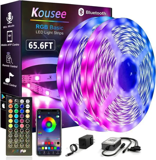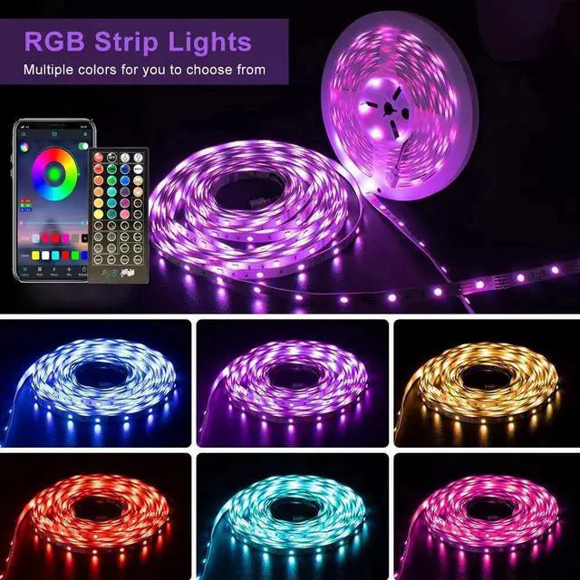Easy to Install Complete LED strip lights kit includes 2 rolls of 32.8 ft LED lights strip, UL and FCC dual certified power adapters, 40-button remote control, controller, instruction manual, no additional equipment required, cut off the light strip at the scissors mark as needed, tear off the self-adhesive and paste it on the surface of the object, Installation is very easy.