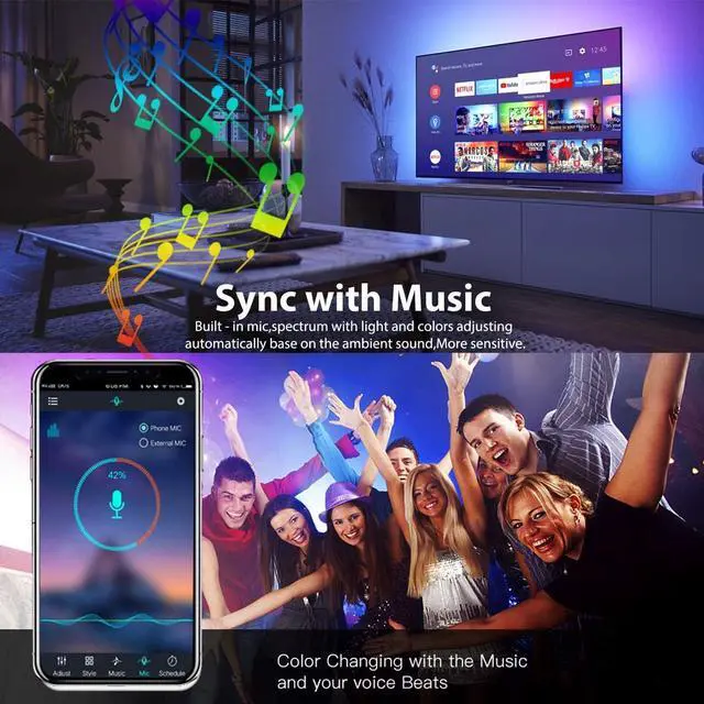 Dancing with the music RGB LED strip lights with smart music mode. Built-in high-sensitivity microphone, the color of the LED lights changes with the rhythm of the music, creating a romantic, relaxing, magical and interesting atmosphere for your party, especially suitable for Christmas, Halloween and other holiday activities.