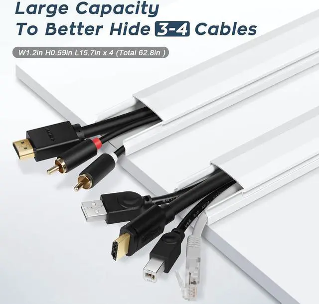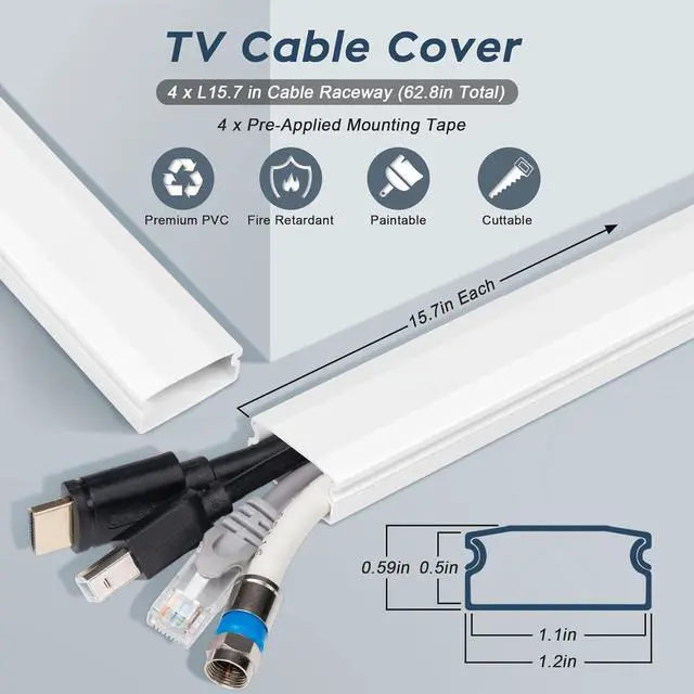 63 inch TV Cord Cover Kit: Each wall wire cover is 15.7 inches long; four sections total 63 inches. It can be easily spliced to the desired installation wire scheme. Connects seamlessly. Can easily conceal messy wires.