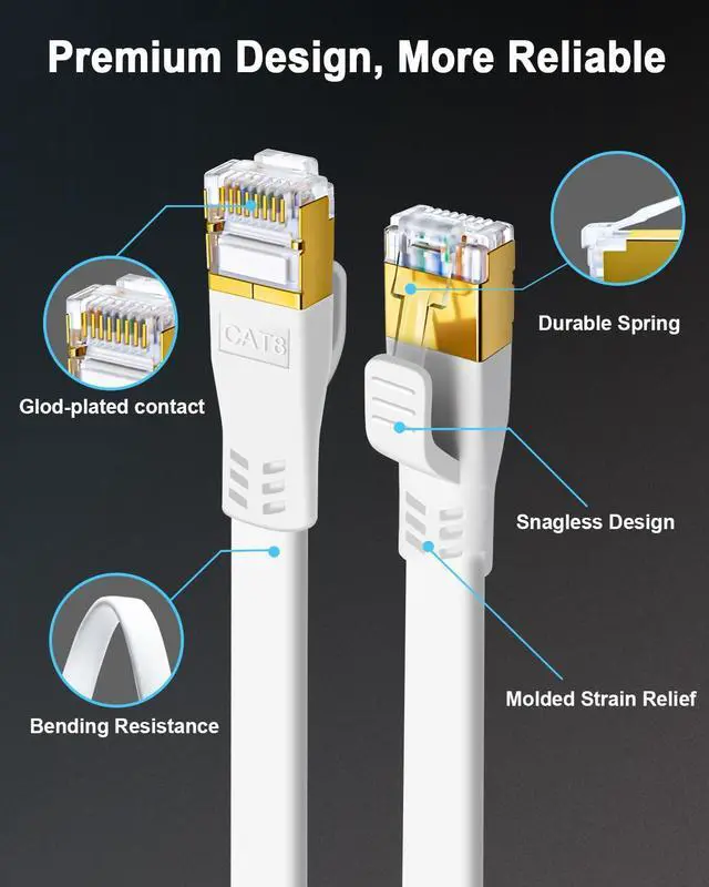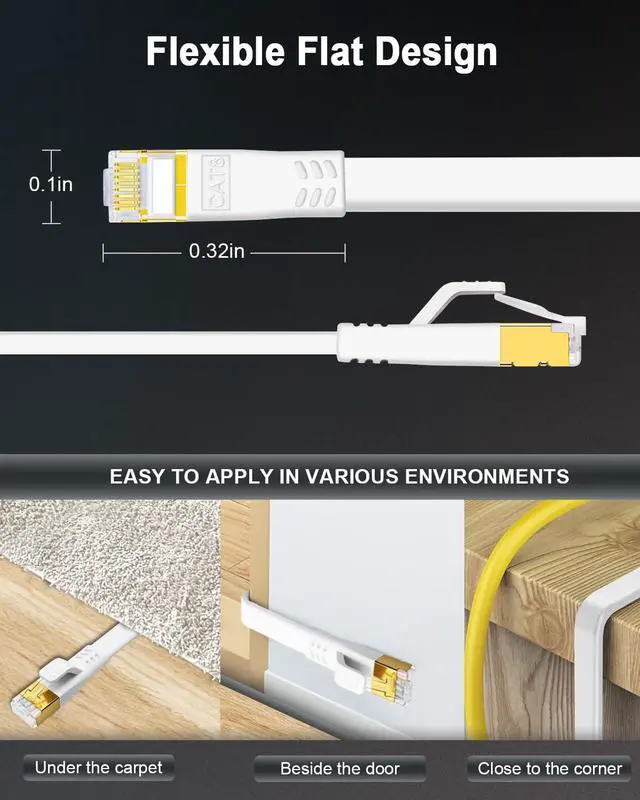 Flexible Flat Design: Ultra-thin design is flexible and can be easily hidden in doorways and carpets to keep your room tidy. Upgraded RJ45 gold-plated connectors (8P8C) on both ends of the patch cable for solid connection to your equipment. 20 feet and above length comes with free cable ties and clips for your easy installation.