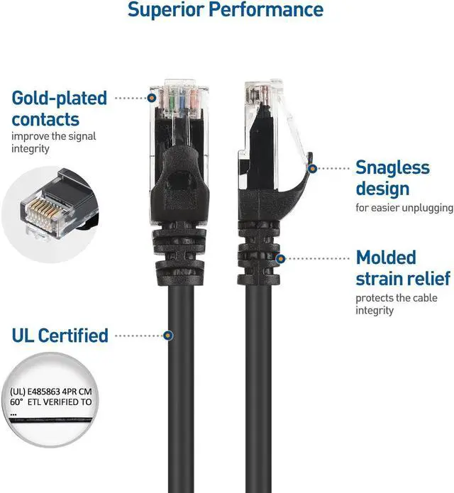 High Performance Cat6, 24 AWG, UL Listed, RJ45 Ethernet Patch Cable provides universal connectivity for LAN network components such as PCs, computer servers, printers, routers, switch boxes, network media players, NAS, VoIP phones, PoE devices, and more