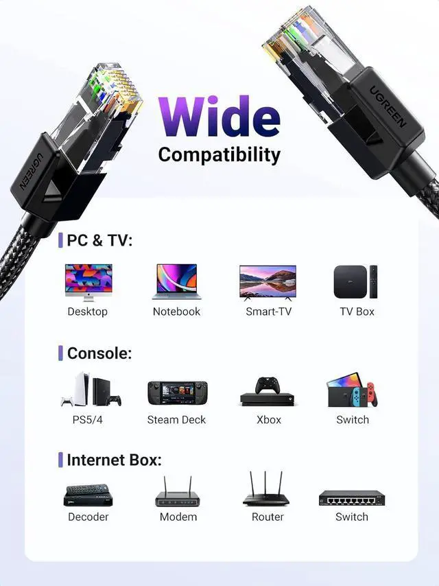 Universal Compatibility: With the RJ45 Connector, UGREEN Cat6 Ethernet cable can compatible with computers, laptops, modems, routers, PS5, PS4, PS3, X-Box 360, X-Box One, Switch, networking switches, ADSL, network adapters, hubs, and other networking devices. Backward compatible with Cat5e, Cat5