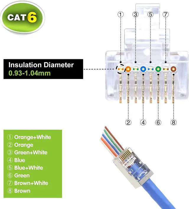 Cat6 PerformanceCat6 RJ45 plugs are backward compatible with Cat5e and Cat5 ethernet connectors. Solid or stranded UTP cable with core diameter 0.93 mm- 1.04 mm, AWG: 23. Suitable for devices with standard RJ45 jacks like PC, ADSL, Router, Switch, etc.