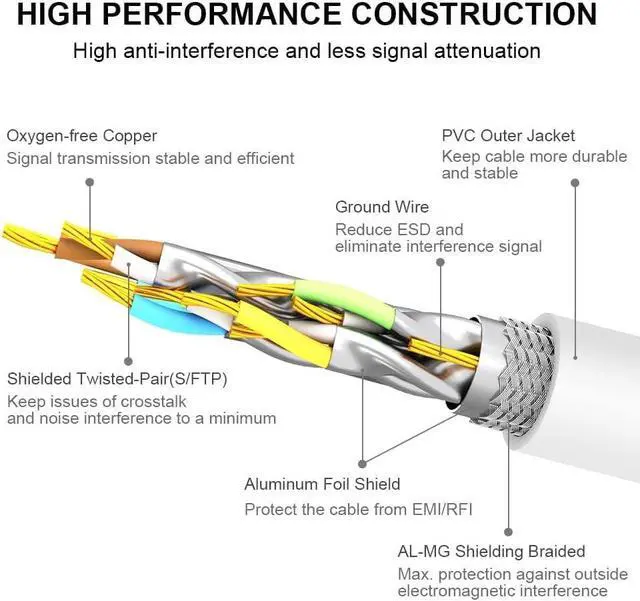 HIGH PERFORMANCE CONSTRUCTION: Made of 4 Pairs 100% 26WAG pure & thick shielded twisted pair (STP) of copper wires which provide better protection from crosstalk, noise, degrade the signal interference. Shielded RJ45 connectors with 50 micron gold-plated contacts ensure corrosion resistance & long-term performance (without noise or signal loss)