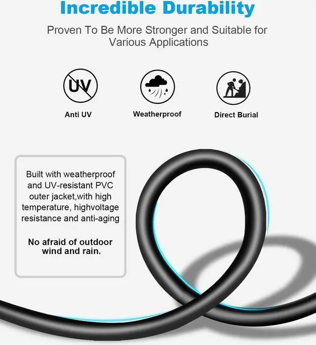 Sufficiently Robust Buried Cable: Thick outer PVC for better corrosion resistance, not easy to age and break. It is more effective to protect against EMI/RFI Interference, water resistance, UV proof, extremely low signal attenuation for long distance transmission and high resistance to external interference. Both outdoor and indoor conditions are permitted to install, also direct burial.