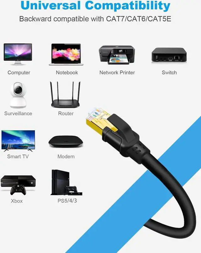 • 40Gbps 2000Mhz High Speed Transmission: CAT8 Ethernet cable support bandwidth up to 2000MHz & transmitting data at speeds of up to 40Gbps, connect to LAN/WAN segments and networking gear at maximum speed. Surf the net, stream video, music and other data at greater speed without worrying about cable mess.