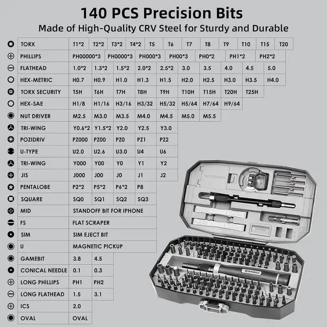 Ultimate Precision Screwdriver SetOur re-engineered precision screwdriver kit includes all the essentials - magnetizer, tweezers, magnetic mat, flex extension, open tool, pry tool, suction cup, and 140 precision bits - Phillips, Torx Security, Triwing, Pentalobe, Star, SAE/Metric Hex, JIS, Triangle. Perfect for PC building, laptop opening, RC assembling, and electronic repairing
