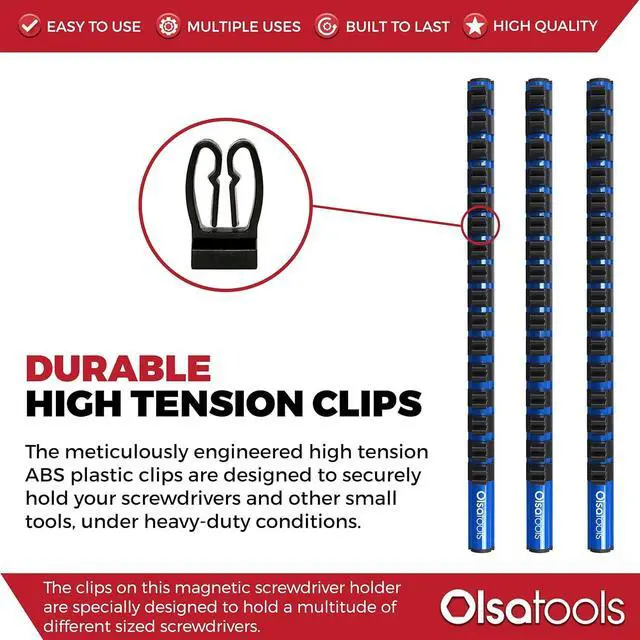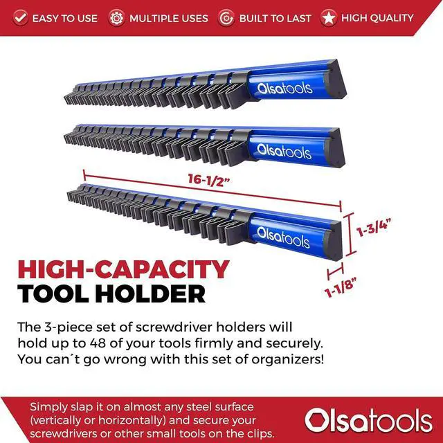 SO EASY TO USE - It's a no-brainer with the Olsa Tools 3 piece screwdriver organizer set. Simply slap it on almost any steel surface (vertically or horizontally) and clip your screwdrivers right in. The clips on the holder are specially designed to hold a multitude of different-sized screwdrivers or wrenches, and even some small tools.